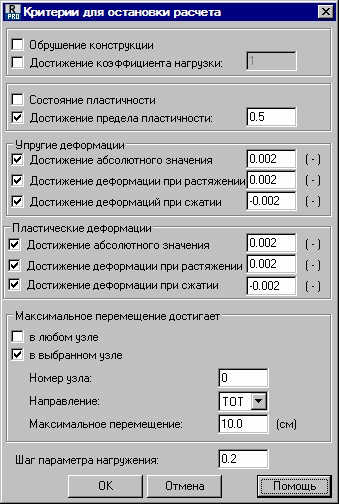 Расчет выполняется до тех пор, пока величина максимального перемещения выбранного узла не достигнет предельной допускаемой величины перемещения, заданного пользователем (>0), или пока не будет достигнуто расхождение итеративного процесса. Расчет останавливается, если осуществляется одно из этих условий.