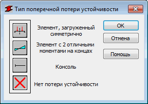 В соответствии с требованиями норм должна быть принята одна из моделей, присутствующих в нормах. Модели в виде иконок представляют принятые в нормах позиции опор. Нажатием последней иконки расчет на устойчивость плоской формы изгиба - расчет бокового выпучивания при изгибе вообще исключается из вычислений.