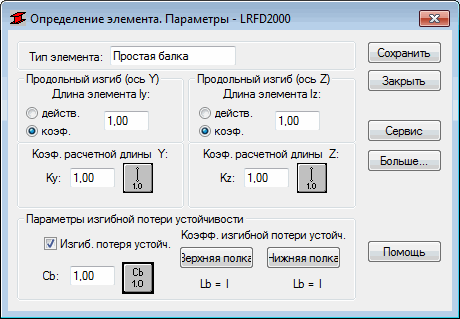 Коэффициенты расчетной длины элемента в двух плоскостях потери устойчивости (Ky и Kz) можно задать в окне редактирования Коэффициент расчетной длины при продольном изгибе. Фактическая длина стержня автоматически вводится в соответствующие поля.