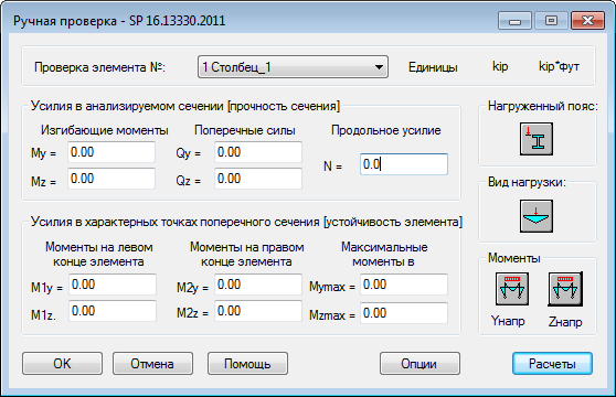 Это диалоговое окно используется для проверки стальных элементов на предмет воздействия на них внутренних усилий, в соответствии с требованиями Российских норм стальных конструкций СП16.13330.2011.