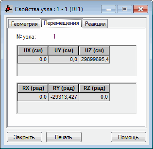 Кроме номера узла эта вкладка представляет значения перемещений, вычисленные для выбранного узла и варианта случая нагрузки. Перемещения представлены в табличной форме. Если активный выбор содержит более одного случая нагрузки, будут показаны максимальные значения перемещений.