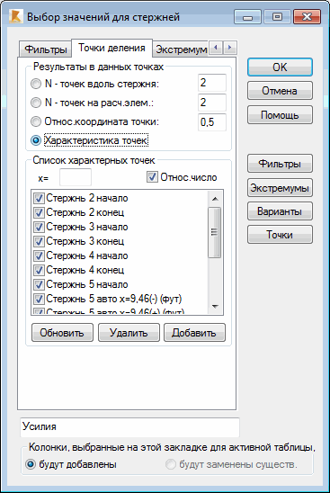 При выборе параметра "N точек по длине стержня" можно задать число точек (включая начальный и конечный узлы), равномерно распределяемых по длине стержня, для которых в таблице будут представлены соответствующие значения. Значение по умолчанию в данном случае N=2. Это означает, что результаты, выбранные для представления, будут отображены в таблице только для начала и конца стержня. Если N=3, в центре стержня будет добавлена точка, разделяя стержень на два равных сегмента, а в таблице будут представлены соответствующие значения. Точку деления также можно задать при выборе варианта "Относительная координата точки". Выберите число из интервала (0;1) для определения расстояния от данной точки до начала стержня. Щелкнув вкладку "Характерные точки", можно определить точку на выбранном стержне, задав относительное или абсолютное расстояние до начала стержня. Значения будут представлены в таблице.