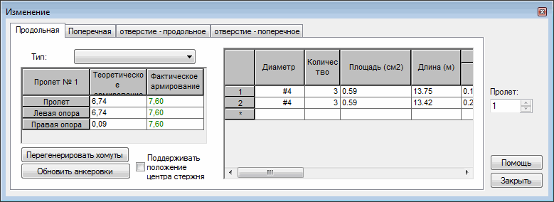 Диалоговое окно содержит несколько вкладок, которые позволяют вносить изменения в армирование:
