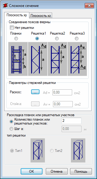 Предполагается, что соответствующие плоскости стоек (решеток) параллельны локальным осям составного сечения (где x — продольная ось элемента, y — горизонтальная ось, z — вертикальная ось). На вкладке "Плоскость XY" пользователь может определять типы планок или решеток, расположенных в плоскости параллельно локальной оси y. Аналогично, вкладка "Плоскость XZ" используется для определения параметров планок или решеток, расположенных в плоскости параллельно локальной оси z. Если активизируется опция "Нет" решетки, то при вычислениях не учитывается тот факт, что сечение составное элемент и расчеты производятся в предположении, что полки являются полностью интегрированным целым в данной плоскости.
