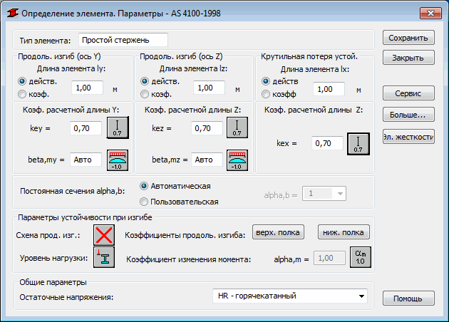 Поле Коэффициент продольной устойчивости используется для определения коэффициента продольной устойчивости элемента в направлении X, Y и Z (key, kez и kex - устойчивость при кручении). Действительная длина элемента (или сумма длин составляющих элементов) вводится автоматически в соответствующие поля. Длина зоны потери устойчивости при кручении используется так, как указано в нормах, в разделе 8.4.4.