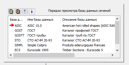 - выбранная база данных сечений передвигается вверх по списку активных сечений;