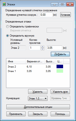 Чтобы удалить этаж необходимо отметить его в списке и нажать на кнопку Удалить. Чтобы удалить все этажи, нажимают на кнопку Удалить все.