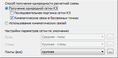 - с помощью кинематических зависимостей - способ подразумевает, что сети для конкретной панели не подвеграются корректировке (проверка на связность сеток не включена). Узлы соединены с помощью кинематических зависимостей; если опция включена, можно определить стандартные размеры конечных элементов для некоторых типов панелей (перекрытия, стены).