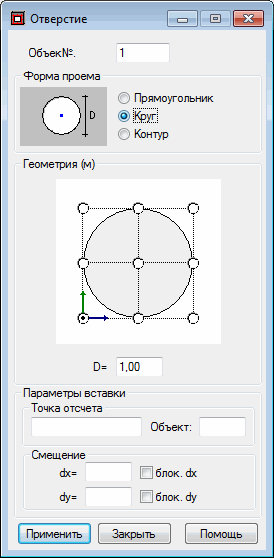 Укажите координаты точки, от которой отмеряются величины смещения dx и dy. Номер активного объекта, в котором будет создано отверстие, представляется в поле "Объект".