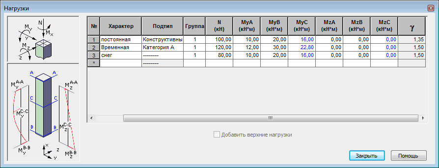 Прим.: Опция Добавить нагрузки от верха колонны активна только тогда, когда определен верх колонны.