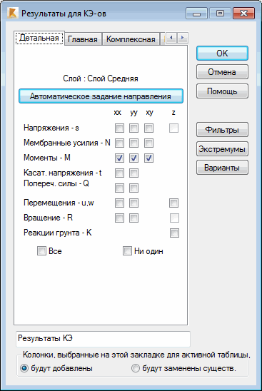 Опция "Слой", которая находится на вкладке Параметры, имеет большое значение для представления в таблице полученных при расчете значений напряжений. Она позволяет выбирать слой, параллельный срединной поверхности поверхностного элемента, для которого будут представлены результаты расчета напряжений. Выбор слоя не оказывает влияния на поперечные силы или перемещения. Они выбираются для средней поверхности и являются постоянным по всей высоте сечения конечных элементов. В нижней части диалогового окна находятся две опции:
