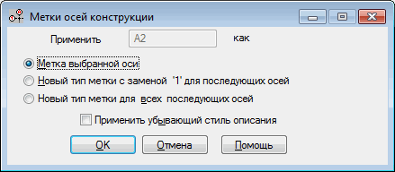 При включении этой опции имя выбранной оси принимается как шаблон для имен всех последующих осей конструкции. Названия всех последующих осей конструкции изменяются в соответствии с шаблоном, заданным пользователем.