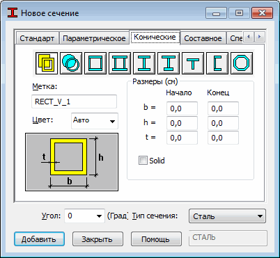 Все опции окна не отличаются от соответствующих опций вкладки Параметрическое. Единственное отличие состоит в том, что размеры сечения задаются как в начале, так и в конце стержня.
