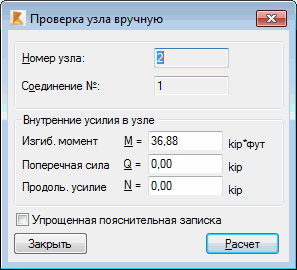 После нажатия кнопки Расчет программа производит расчеты выбранного типа соединения для заданного узла конструкции. Будут определены внутренние усилия в соединении (N, Q, M).