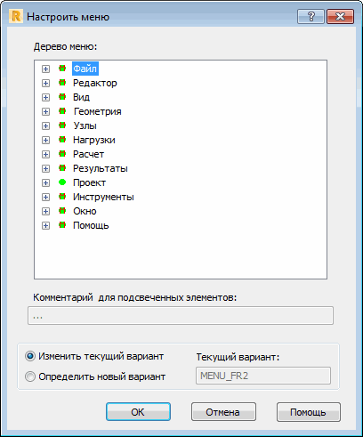 В верхней части диалогового окна располагается дерево меню. Зеленым кружком отмечены опции, доступные из меню в данный момент. Красный кружок обозначает опции, в данный момент недоступные. Выбором соответствующей опции пользователь может изменить цвет кружка и тем самым добавить опцию в меню или удалить ее из меню. Зеленый кружок с буквой М означает, что опцию нельзя удалить.