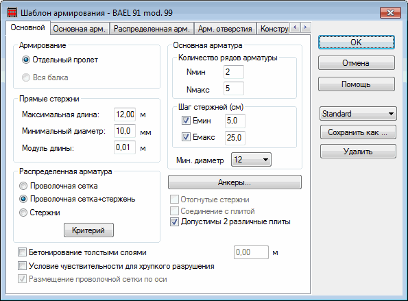 Опции, расположенные в диалоговом окне, позволяют задать основные параметры, относящиеся к армированию балок-стенок.