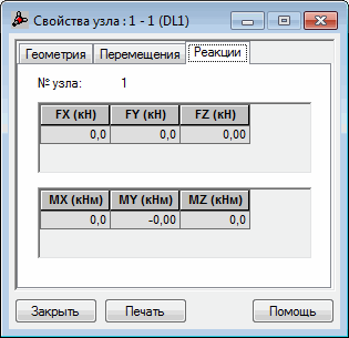 Кроме номера узла эта вкладка представляет значения реакций (в общей системе координат), вычисленные для выбранного узла и варианта нагрузки. Реакции представлены в табличной форме. Если активный выбор содержит более одного случая нагрузки, будут показаны максимальные значения реакций.