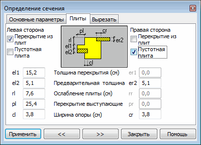 Если обе опции (Левая / Правая плита) неактивны, то автоматически вызывается прямоугольное сечение (при условии, что не были определены разрезы).