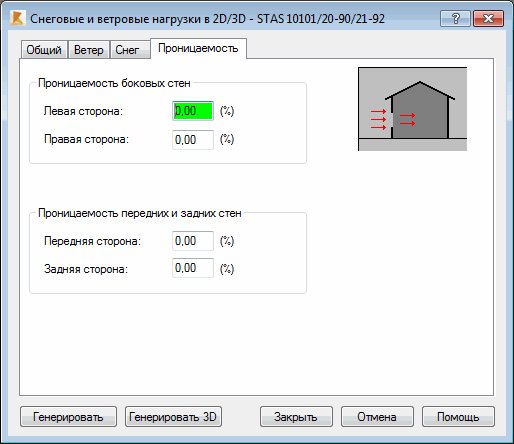 При переходе в диалоговом окне "Снеговые/ветровые нагрузки" на вкладку Проницаемость открывается следующее диалоговое окно.