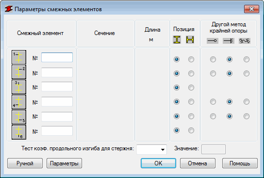 Как только присоединенные стержни с выбранными номерами описаны, в нижней части диалогового окна может быть проверен коэффициент продольного изгиба. Значение коэффициента, определенного программой, дается в поле Значение. Значение появляется после ввода очередного номера присоединенного стержня в поле Тест коэффициента продольного изгиба для стержня.