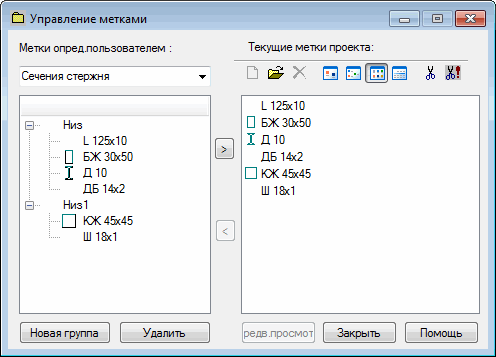 Для диалогового окна "Управление метками" предусмотрено хранение библиотеки меток для элементов конструкций, таких как опоры, степени свободы, сечения и параметры норм. В этой библиотеке можно сохранять пользовательские метки для дальнейшего использования в проектах других конструкций.