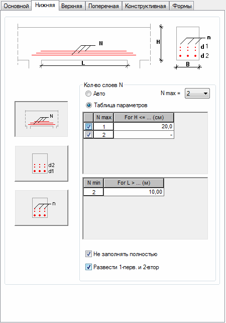 В случае, когда армирование должно выполняться слоями, опции, находящиеся в поле Кол-во слоев N, позволяют определить принцип выбора армирования/
