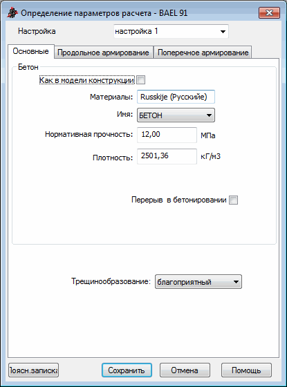 Вкладка "Основные" диалогового окна Определение параметров расчета для норм BAEL представлена ниже: