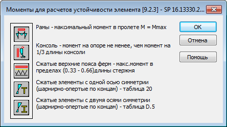 Опции в этом диалоговом окне позволяют определить схемы распределения изгибающего момента вдоль длины анализируемого элемента. Эта информация применяется при проверке устойчивости элементов, которые подвержены одновременному действию силы сжатия и изгибающих моментов (см. пункт 9.2.3, таблицу 20 и приложение D).