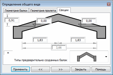 В нижней части диалогового окна находится список подбора, содержащий предварительно определенные типы балок. После подбора геометрической модели выбранные размеры можно редактировать в полях, где схематически изображена балка. Количество размеров зависит от выбранного типа балки.