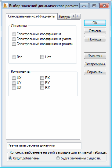 - Компоненты. В зависимости от выбора в диалоговом окне, будут отображаться столбцы, в которых компоненты Ux, Uy, UZ, Rx Ry или Rz будут иметь следующие значения: коэффициент спектрального режима, коэффициент спектрального участия и спектральный коэффициент.