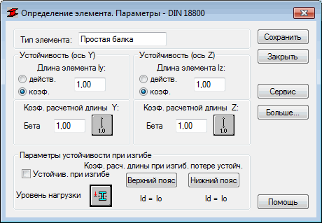 Коэффициенты расчетной длины элемента в обоих направлениях (Бета y и Бета z) содержатся в диалоговом окне "Коэффициент расчетной длины". Фактическая длина стержня (или сумма длин составляющих компонентов) автоматически вводится в соответствующие поля.