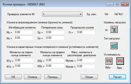 Параметры диалогового окна "Ручная проверка" позволяют осуществлять проверку стальных элементов по значениям усилий, определенным пользователем в соответствии с китайскими нормами для стальных элементов GB50017 - 2003. Это диалоговое окно открывается посредством команды меню Проект Создание стального элемента. Опции Проверка. Затем на экране появится представленное ниже диалоговое окно.