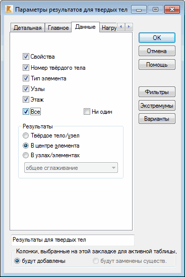 При переходе на вкладку "Данные" диалогового окна Параметры результатов для твердых тел на экране появляется следующее диалоговое окно .