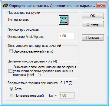 Опция используется для определения дополнительных параметров деревянных стержней, содержащихся в нормах. Опция доступна при нажатии на кнопку "Больше" в диалоговом окне Определение элемента. Параметры.