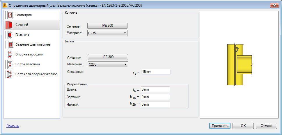 На вкладке "Сечения" определяются сечения для колонны и балки в соединении.