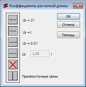 Выше упомянутое диалоговое окно содержит схемы типичных условий закрепления концов стержня, основанные на выборе коэффициента расчетной длины. Пользователь может также определить коэффициент приведенной длины самостоятельно, для чего следует использовать последнюю иконку и предусмотренное этой опцией поле редактирования. Истинные длины регулируются коэффициентом на который умножается основная длина элемента, чтобы получить значение расчетной длины при продольном изгибе. Длина Iz принимается за основную. Пользователь также может ввести значение коэффициента или выбрать его автоматически, нажатием на иконку, соответствующую характерному варианту положения опоры.