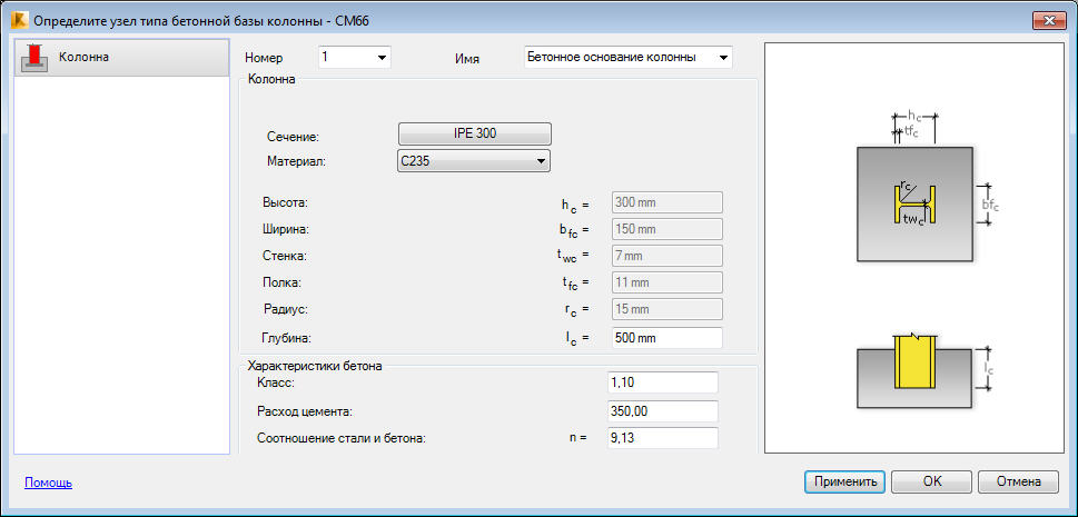 На вкладке "Колонна" задаются параметры колонны (т.е. сечение и материал).