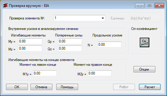 3. в поле Момент изгиба в концах элемента: ввести значения соответствующих изгибающих моментов (доступные значения показаны в правом верхнем углу диалогового окна) необходимых для расчета элемента;
