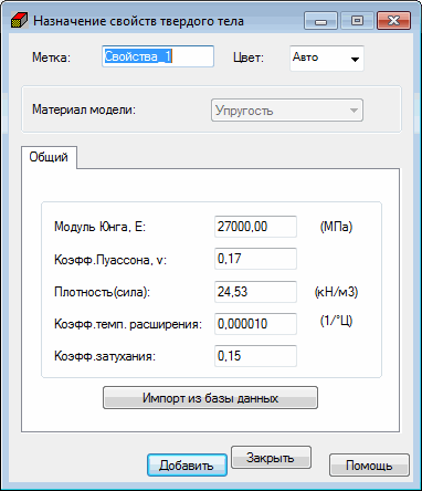 При нажатии на кнопку "Импорт из базы данных" открывается дополнительное диалоговое окно, в котором можно выбрать материал, доступный в базах данных материалов. После выбора материала параметры отображаются в соответствующих полях диалогового окна "Назначение свойств твердого тела".
