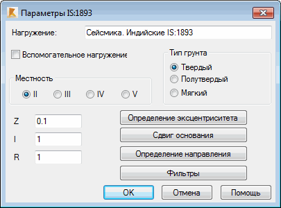 Параметры сейсмического расчета конструкции зависят от выбора сейсмических норм, по которым производится расчет влияния сейсмических нагрузок на конструкцию. При выборе индийских сейсмических норм (IS 1893) в диалоговом окне Новый вариант или при нажатии на кнопку Параметры в диалоговом окне Тип расчета (должен быть подсвечен вариант сейсмического расчета) на экране появляется диалоговое окно, показанное ниже.