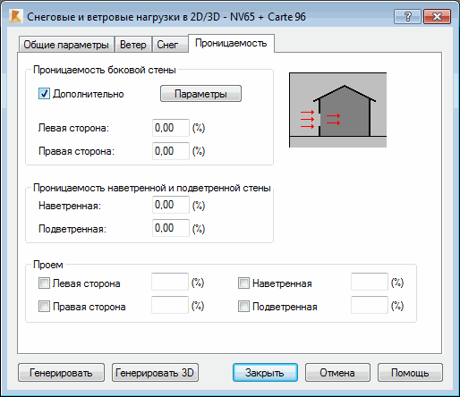 При переходе в диалоговом окне Снеговые/ветровые нагрузки на вкладку Проницаемость открывается следующее диалоговое окно.