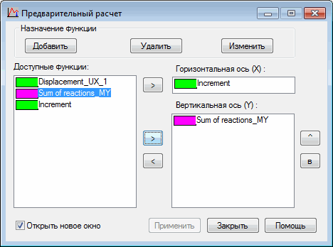 Если выбраны различные типы вариантов нагружения (выбор включает все варианты нелинейных расчетов и расчет динамических процессов), то в одном окне могут быть представлены графики только одного типа расчета. Показанное выше диалоговое окно Предварительный анализ содержит целый ряд опций.