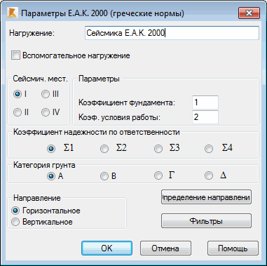 Параметры сейсмического расчета конструкции зависят от выбора сейсмических норм, по которым производится расчет влияния сейсмических нагрузок на конструкцию. Выберите греческие сейсмические нормы E.A.K. 2000 или E.A.K 2000/2003 в диалоговом окне Определение нового нагружения или нажмите на кнопку Параметрыs в диалоговом окне Тип расчета.
