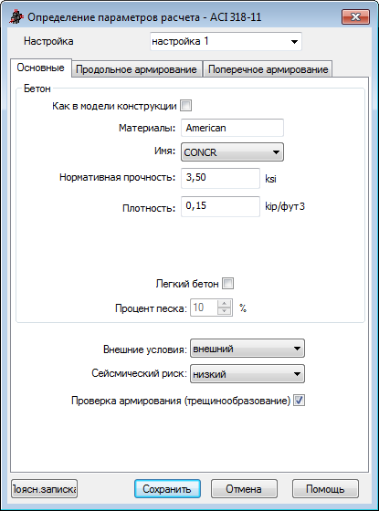 Прим.: Содержимое этого окна зависит от выбранных железобетонных норм. Для других норм внешний вид этого окна может отличаться от показанного выше.