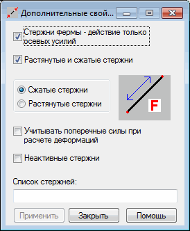 Сжатие стержней и Растяжение стержней. Расположенное ниже поле редактирования используется для определения (графически или путем ввода номеров стержней вручную) стержней ферм, стержней, которые могут работать только на растяжение или только на сжатие, а также стержней, поперечные силы в которых влияют на деформации конструкции и это влияние должно учитываться при вычислении деформаций.