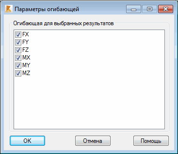 - Огибающая только для выбранных результатов – если эта опция активна, то огибающая рассчитывается только для выбранных величин (значения сопутствующих показываются для всех остальных величин). Нажмите кнопку Огибающие для того, чтобы открыть диалоговое окно Параметры огибающей со списком результатов, которые учитываются при расчете огибающей. Если отключена опция Огибающая с сопутствующими значениями, тогда будет недоступна опция Огибающая только для выбранных результатов.