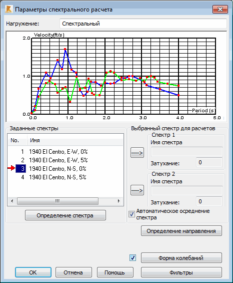 При нажатии на кнопку Определение спектра можно в дополнительном диалоговом окне определить новый спектр или модифицировать существующий. Чтобы выбрать спектр, выберите один из определенных спектров в поле спектр в поле Заданные спектры и нажмите на верхнюю кнопку с символом →. Спектральный анализ конструкции будет выполнен для выбранного спектра, находящегося в поле Спектры для расчета. Имя выбранного спектра и затухание для этого спектра появятся в соответствующих полях, а в координатной системе наверху будет показан график спектра.