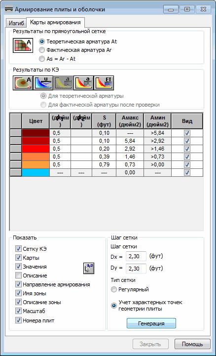 Эта вкладка находится в диалоговом окне Армирование плит и оболочек и позволяет представлять и изменять карты армирования, прогибов, трещинообразования и жесткости.