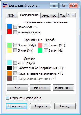 Опция Детальный расчет используется для выбора величин, которые должны быть представлены для стержней, выбранных из конструкции, а также для назначения параметров представления результатов расчета.