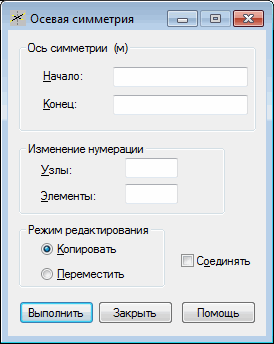 Если для курсора выбран режим Сетка или Авто, координаты точек, определяющих ось симметрии, отображаются в полях редактирования. Если для курсора выбран режим Узел, номера узлов, определяющих ось симметрии, отображаются в полях редактирования Начало и Конец.